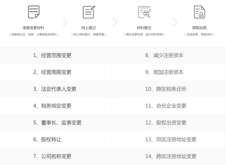 3、公司變更的事項類型包括:公司名稱、住所、法定代表人、注冊資本、經(jīng)營范圍、公司組織形式、股東信息、公司合并分立等。
